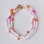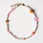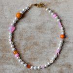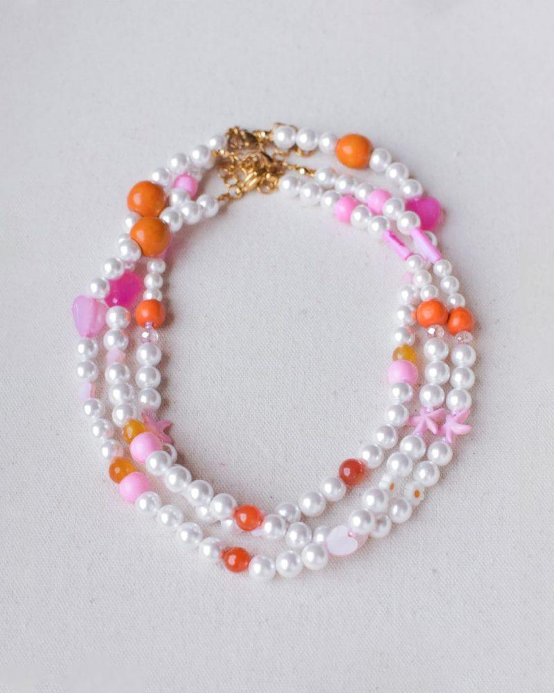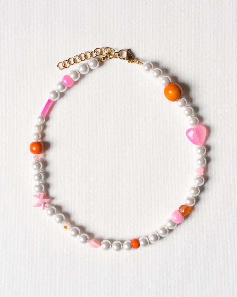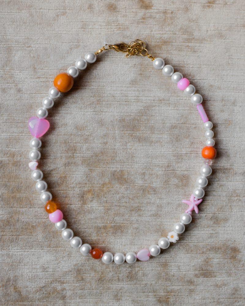 Una collana leggera e spensierata, che profuma di pomeriggi assolati e caramelle zuccherate. Perle bianche si alternano a dettagli colorati rosa, fucsia e arancio, tra stelline, cuori e perline irregolari. Ogni pezzo è unico, composto a mano con piccoli elementi diversi tra loro — proprio come i tuoi ricordi d’estate. Perfetta da sola o in layering. Lunghezza: 40cm + 5cm
