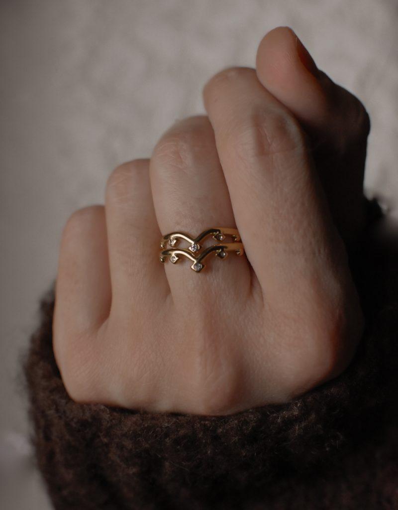 Una curva morbida che segue il gesto, illuminata da piccoli punti di luce. Elara è delicato ma presente: un equilibrio sottile tra grazia e carattere. Da indossare come un segno intimo, quasi istintivo.
