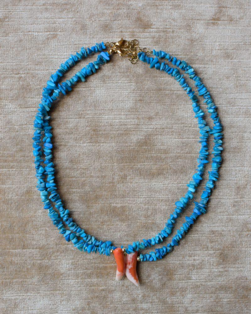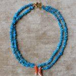 Collanina Flamenco. Girocollo in turchese e charm centrale in corallo per una collanina dal sapore mistico e gitano. Lunghezza: 40 + 5 cm catenella