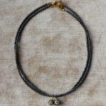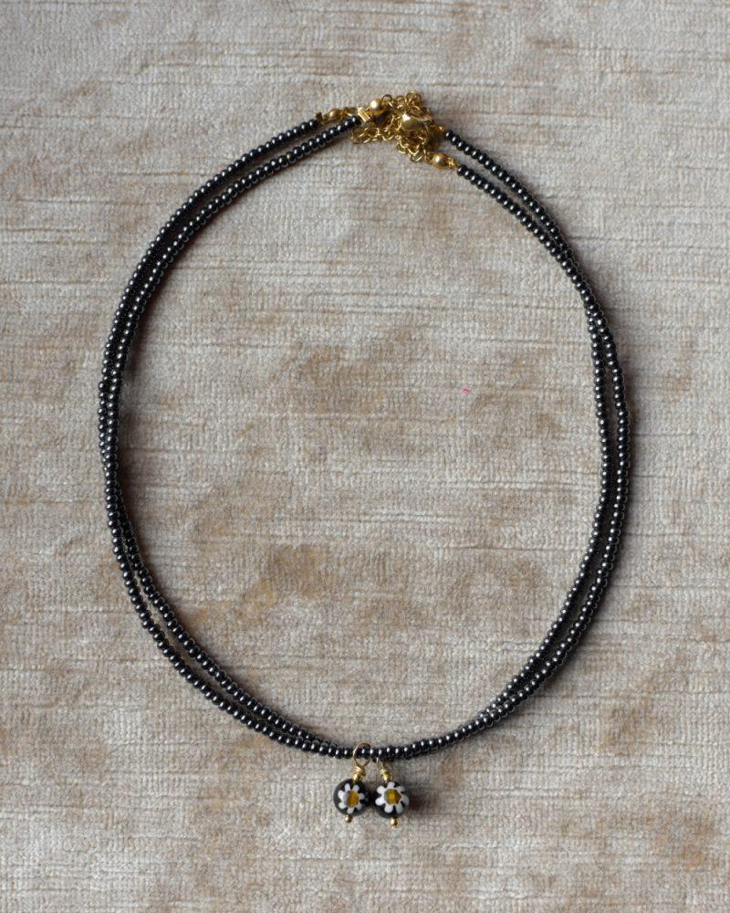 Collanina Garden night. Una collana sottile e raffinata, composta da perline in vetro blu notte, dal riflesso quasi nero. Il piccolo charm a forma di margherita aggiunge un tocco delicato e può essere facilmente rimosso per un look ancora più minimal. Perfetta da indossare da sola o in abbinamento con altri pezzi. Lunghezza: 35cm + 5cm catenella