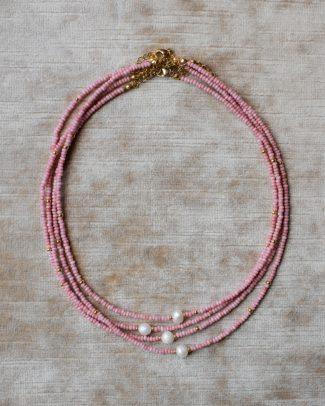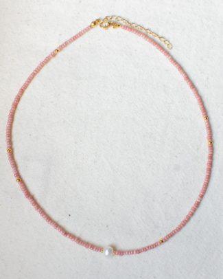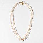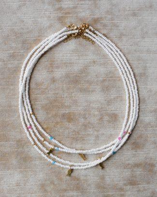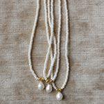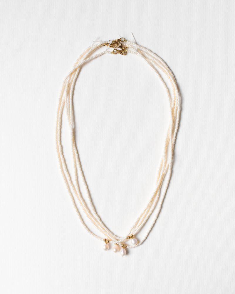 La superficie è morbida, lattiginosa, con una brillantezza discreta che riflette la luce senza eccessi. Ogni collanina in microperle color avorio è rifinita da una singola perla naturale leggermente irregolare, incastonata in piccoli dettagli dorati.