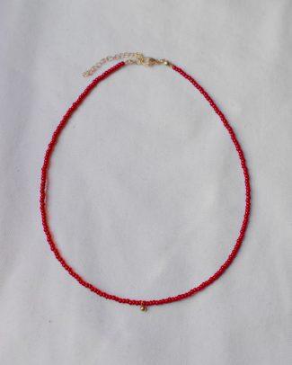 Collanina Lipari. Un tuffo nelle acque limpide delle isole Eolie: perline bianche e rosso rubino dipinte a mano, con un dettaglio centrale turchese come il mare. Fresca, leggera e perfetta per portare un tocco di estate con te ogni giorno. Lunghezza: 43 + 5 cm