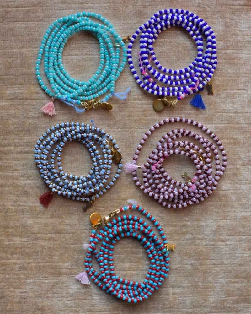Loop. Le micro perline creano un ritmo continuo, quasi ipnotico, mentre il dettaglio della nappina e il piccolo charm dorato interrompono la perfezione con un gesto inatteso. All’interno, un filo in cotone e seta rende la collana morbida e flessibile, pensata per essere indossata lunga o avvolta in due giri, adattandosi con naturalezza al movimento. Lunghezza: 80cm ca.