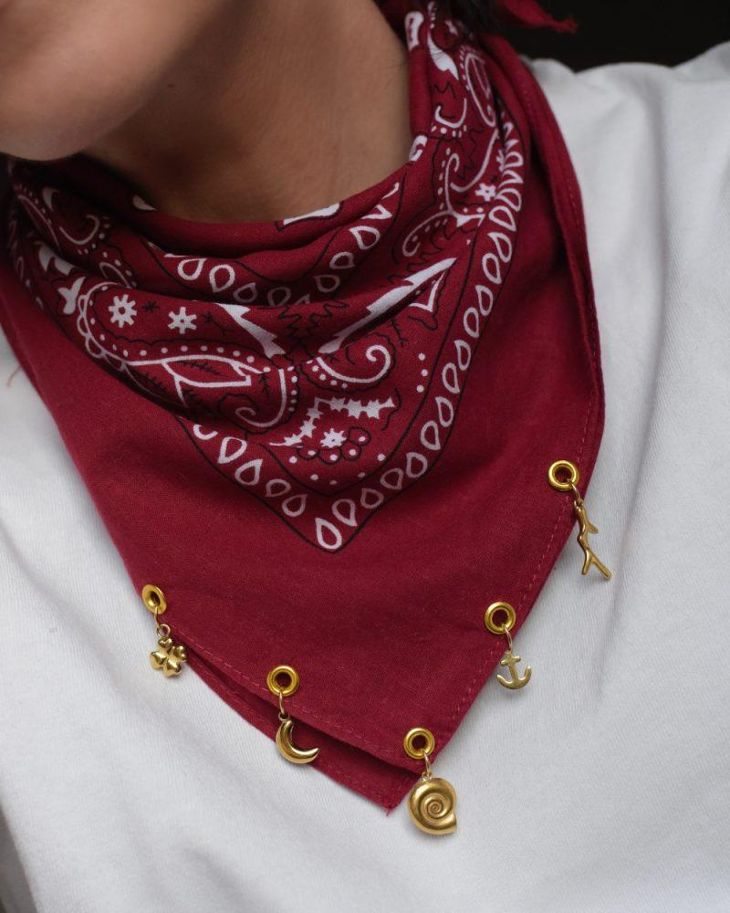 Scegli il colore della tua bandana e abbinala ai ciondoli del nostro Charm Bar. Che tu ami i simboli del mare, le stelle o i piccoli amuleti dorati, ogni bandana diventerà un pezzo unico che parla di te.