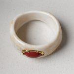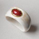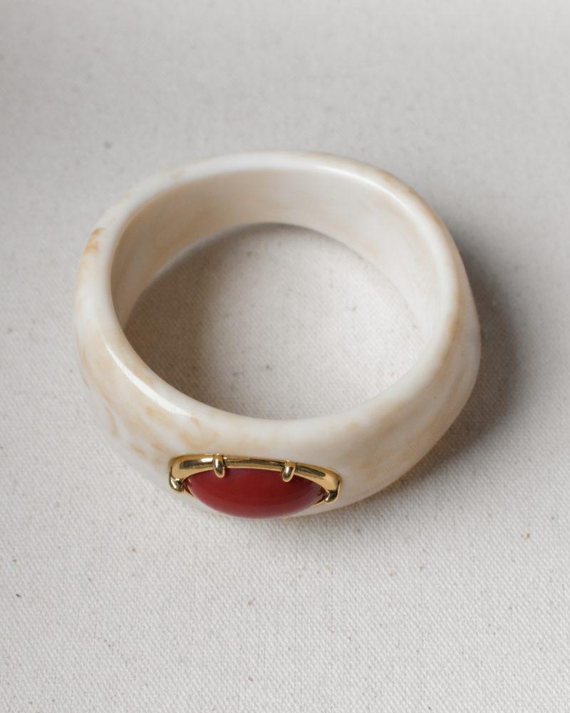 Mesa richiama le distese calde del deserto, dove la luce scolpisce la terra e il tempo lascia tracce silenziose. La fascia in resina color avorio, attraversata da leggere venature naturali, accoglie al centro un elemento rosso intenso che emerge come un punto di fuoco sotto il sole. Il contrasto tra le tonalità chiare e il rosso caldo crea un equilibrio deciso, quasi primordiale. Mesa è un talismano: essenziale, caldo, radicato nello spirito del deserto.