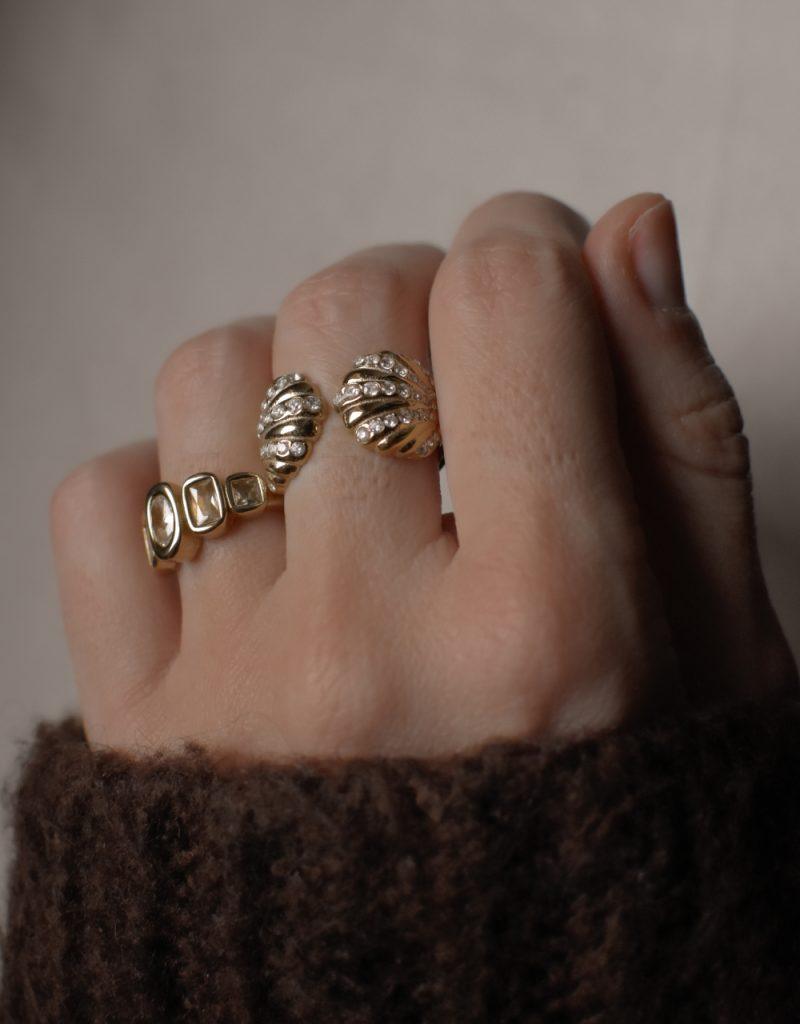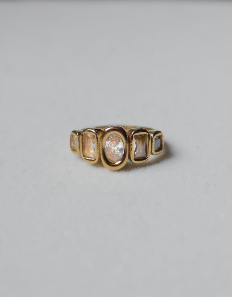 Anello Noa. Deciso e contemporaneo, scandito da castoni geometrici che catturano la luce in modo netto e controllato. Le pietre, incassate una accanto all’altra, creano un ritmo visivo essenziale, forte ma raffinato.