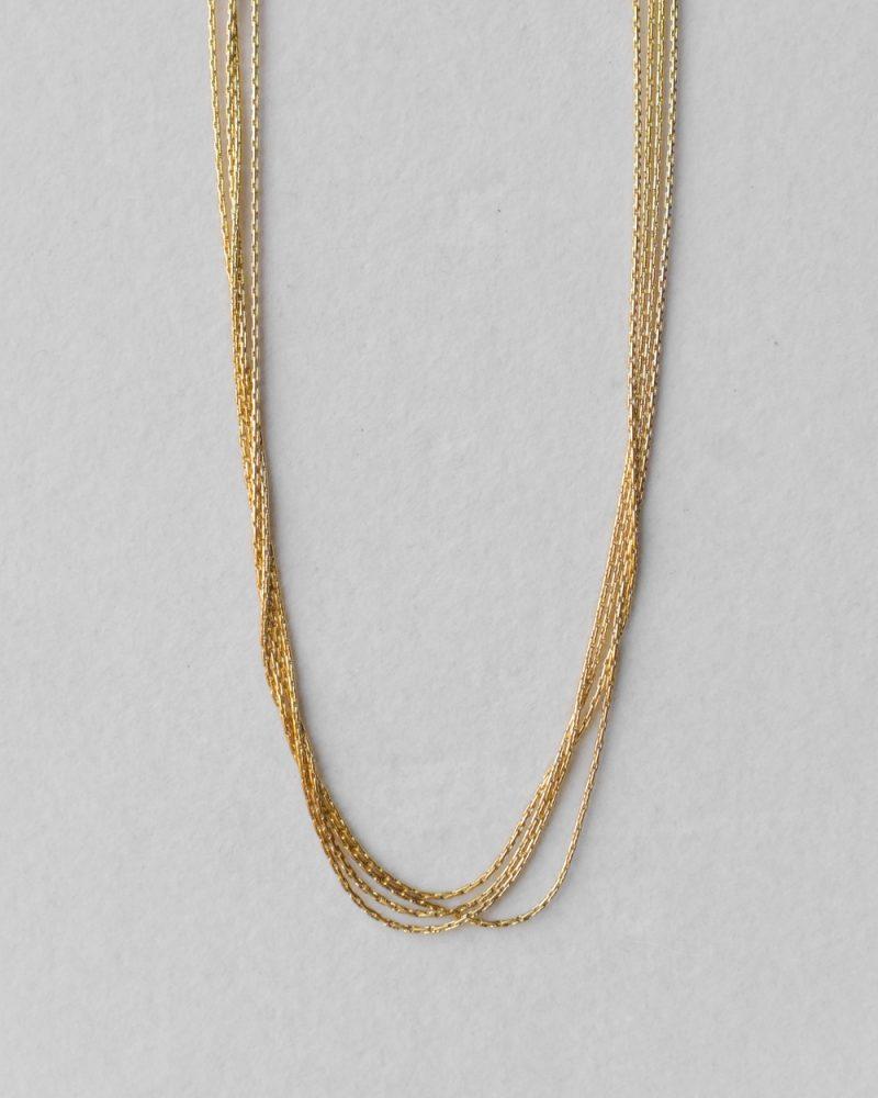 Fili sottili dorati si muovono insieme con naturale leggerezza, come onde che arrivano silenziose sulla riva. La luce scivola tra le catene creando un effetto fluido e luminoso, delicato ma prezioso. Riva è una collana essenziale, ispirata al movimento dell’acqua e a quell’aria di mare che definisce l’universo Tual. Lunghezza: 35 cm + 5 cm catenella