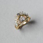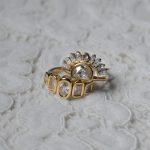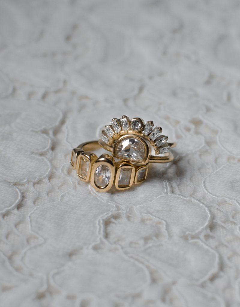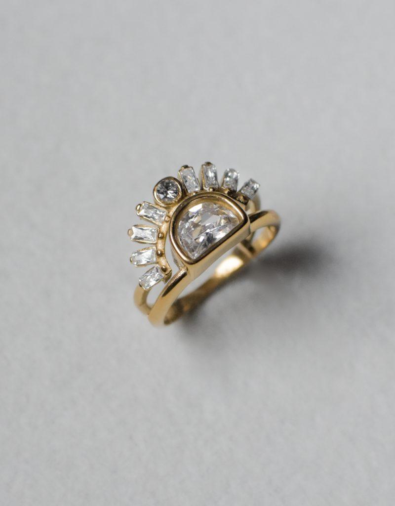 Seraphine unisce una pietra centrale scolpita a tagli netti e una corona di cristalli che catturano la luce con intensità controllata. Le forme dialogano tra loro creando movimento, equilibrio e presenza.