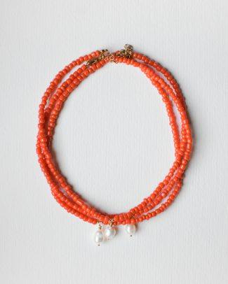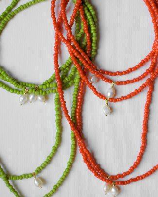 Collanina Spuma di Mare. Perline in vetro total white colorate in pasta, processo che assicura la permanenza del colore. Lunghezza: 35 + 5 cm catenella