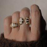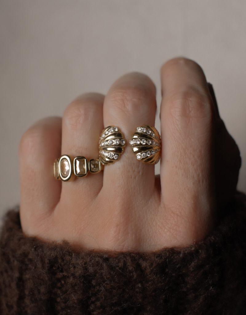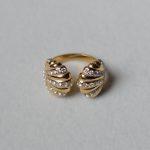 Volumi scolpiti e luce incastonata. Théodora gioca sul contrasto tra materia piena e brillanti che seguono il movimento dell’anello, creando profondità e ritmo. Aperto, deciso, ma sorprendentemente equilibrato.