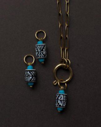 Ciondolo Turquoise secrets in ceramica dipinta a mano e inserti in acciaio, piccole opere d’arte uniche e speciali.